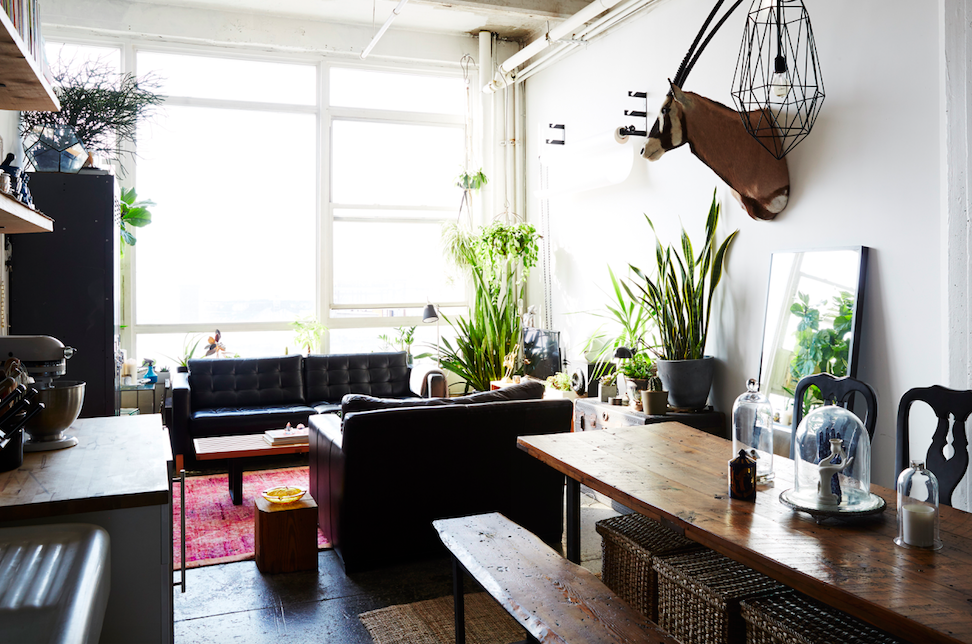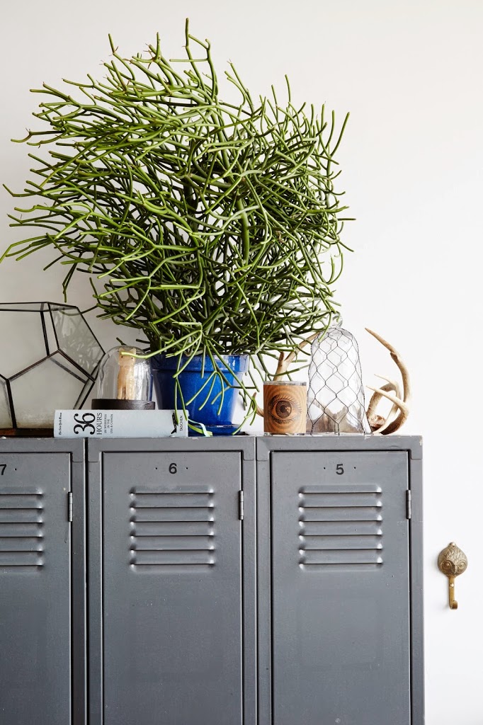 On growing an urban jungle: Don’t let the plants fool you; my thumbs are not green. The trick is choosing plants that ward off death—species that thrive in the face of neglect. I’ve had succulents for years — they’re the ultimate gateway plants. For everything else, my friend Rebecca runs a company called Greenery NYC, which specializes in really amazing plant installations, designs and events. She helped me choose and pot some of the more impressive additions, like the pencil cactus on top of the lockers.
