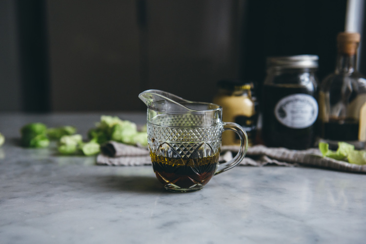 In a liquid measuring cup, whisk together maple syrup, balsamic vinegar, mustard, olive oil, salt, and pepper until emulsified. Set aside while you prepare the brussels sprouts.