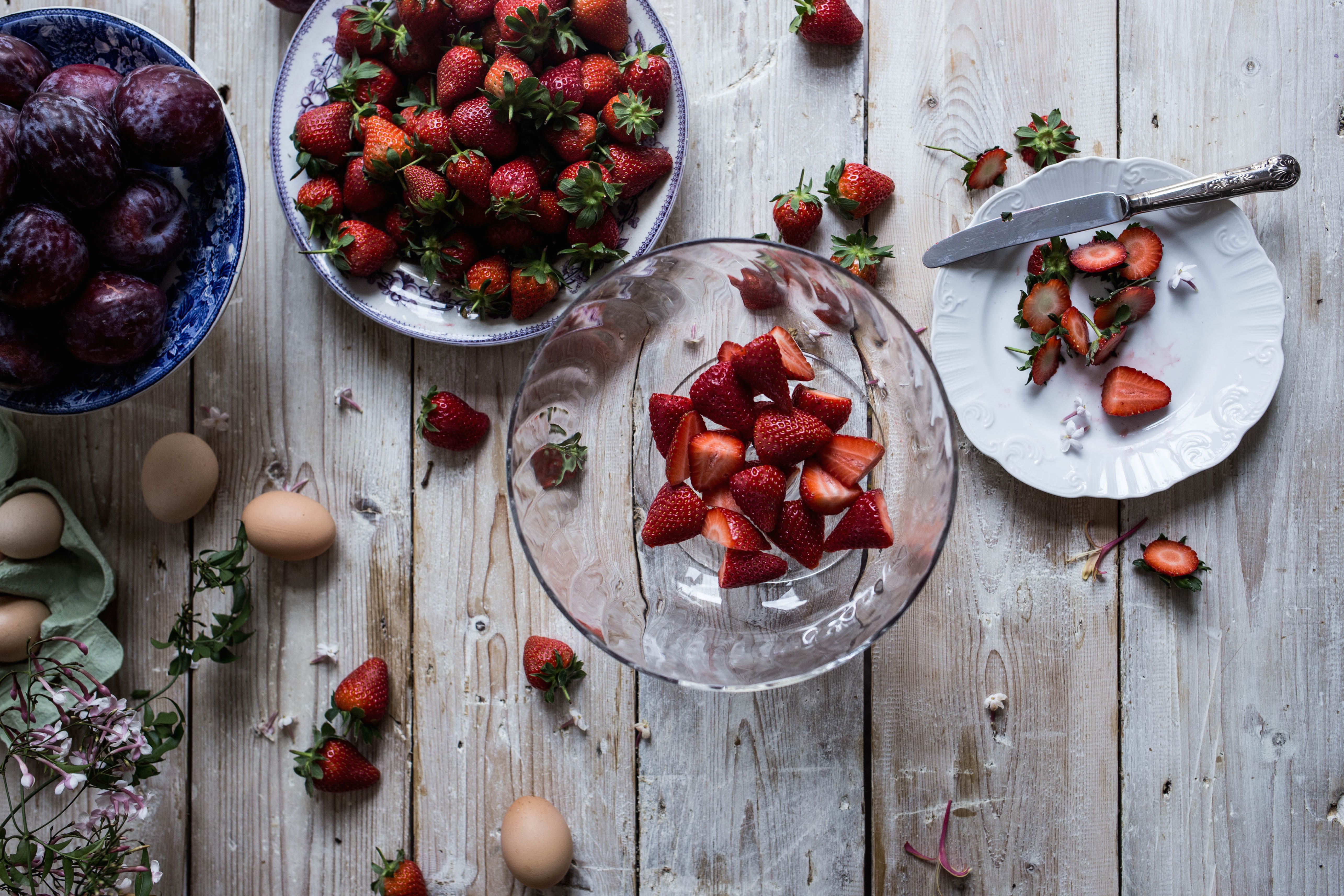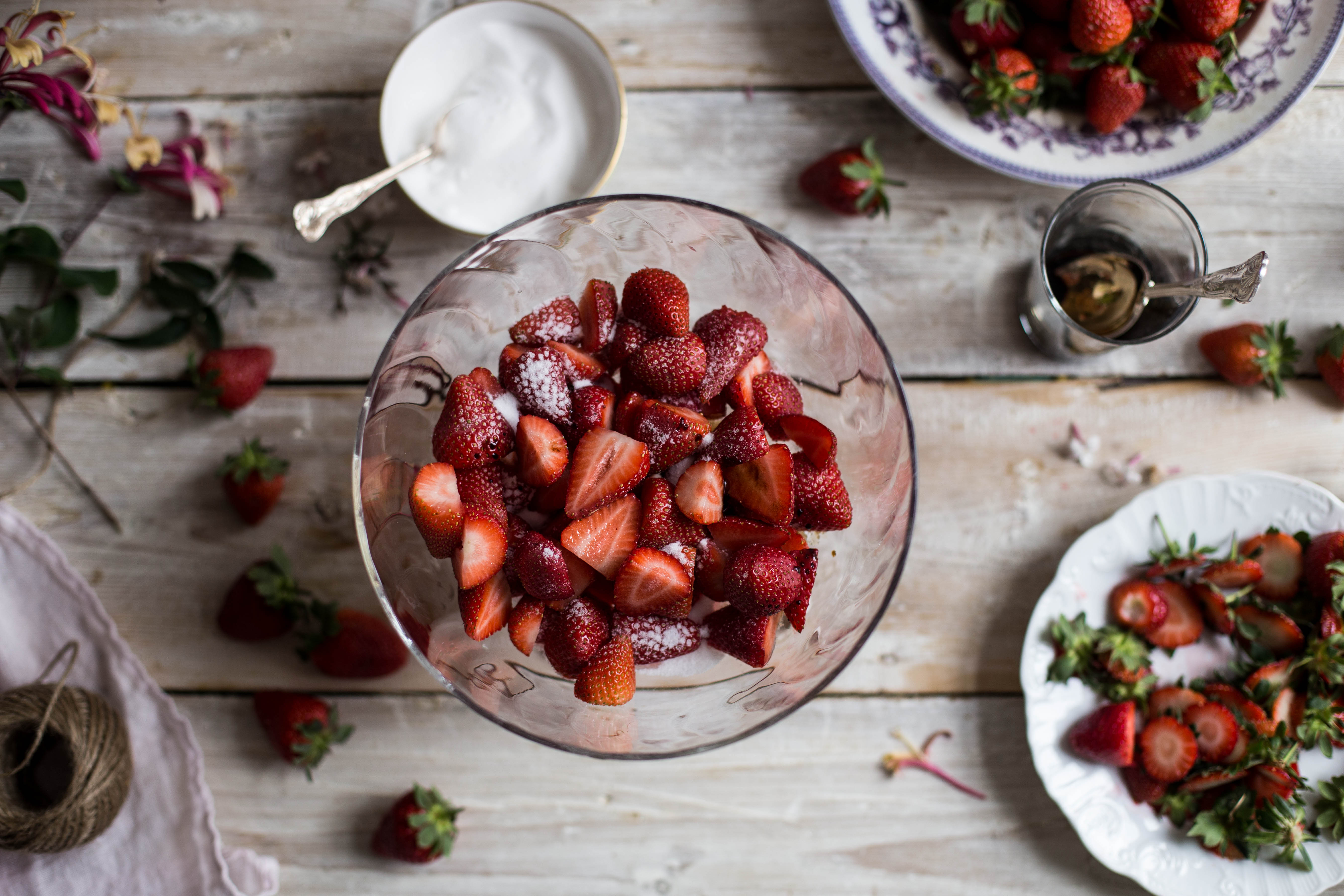 Hull the strawberries and cut them in half. Toss them into a bowl, sprinkle with the caster sugar and drizzle with the balsamic vinegar, then squeeze in the juice of the lemon. Toss the strawberries in the juices and set them in the fridge to rest for an hour or so.