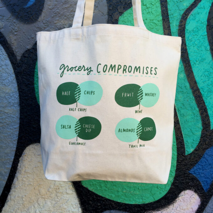 Cute! I was about to purchase it when I remembered a recent article in The Atlantic: “Shoppers Buy More Junk Food When They Bring Their Own Bags”! Sorry, Emily.