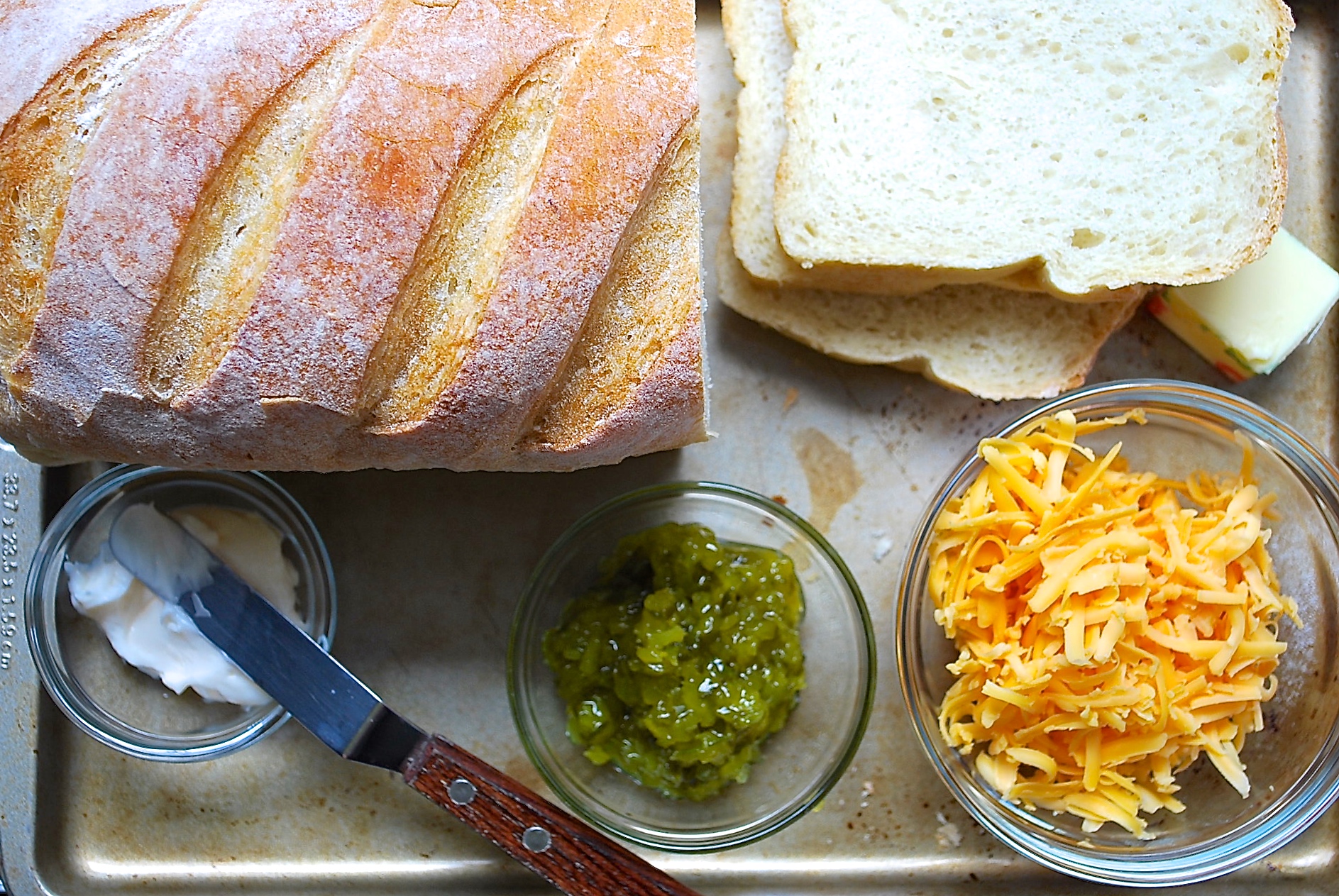 Just use a basic white sandwich bread. I’d skip the Wonderbread (too squishy) but anything else is fine. My dad uses Cracker Barrel cheddar cheese and I do too. Yes, expensive cheese will also taste good, but you really don’t need it. The butter and mayonnaise can be whatever brand you have on hand. The relish should be sweet, but that’s the only requirement.