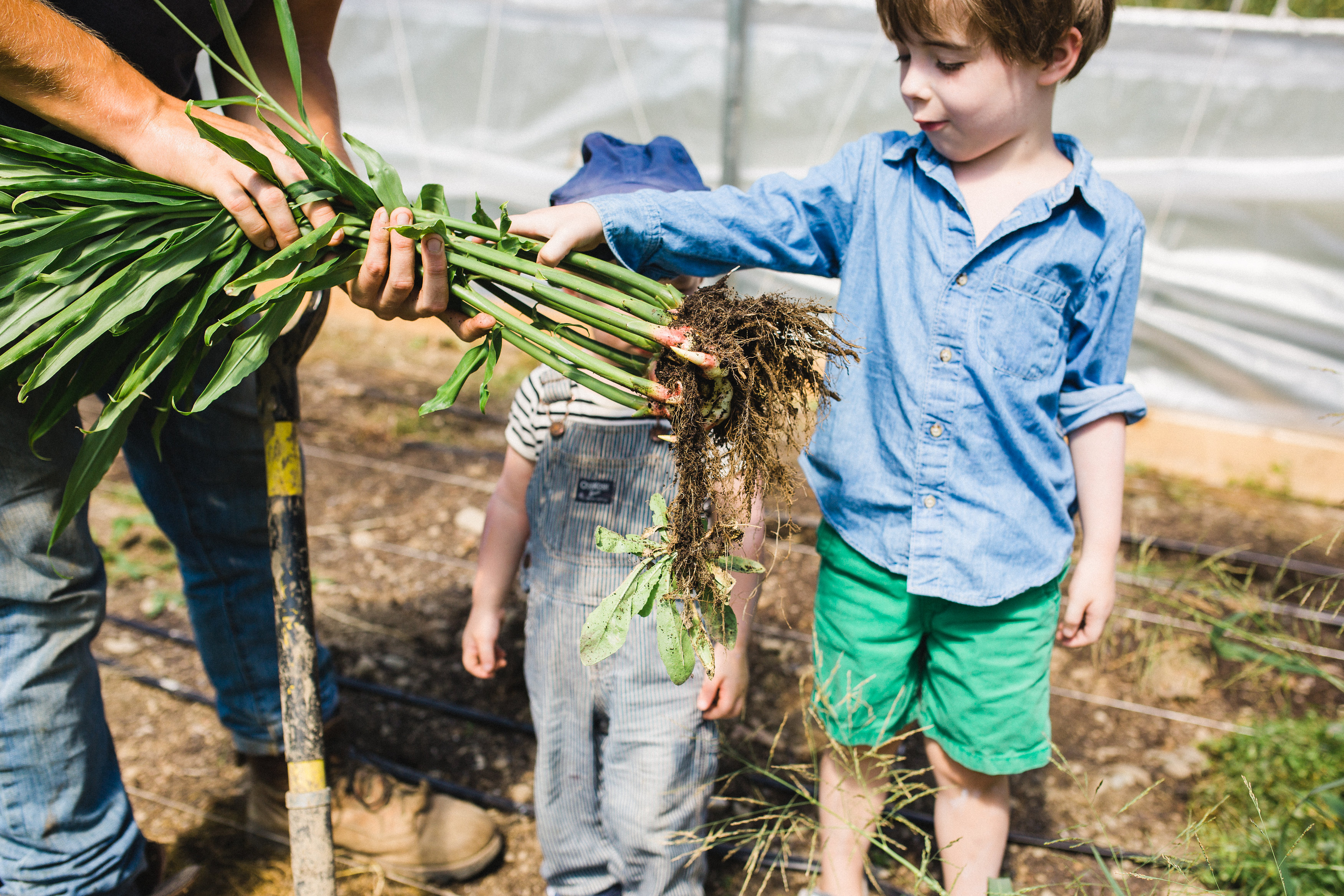 First we stepped into a humid greenhouse to help harvest ginger. The boys were excited to pull it up from the ground.