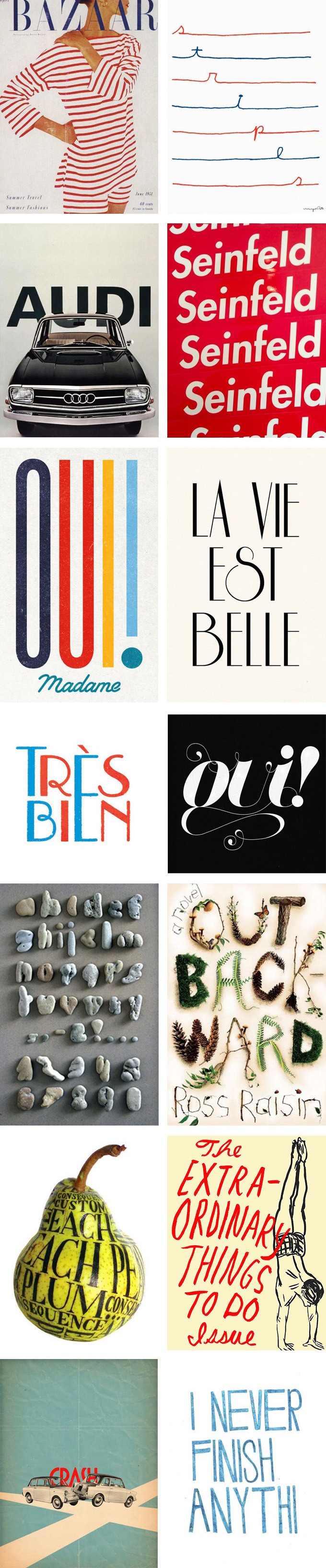 (Thanks to Stella and Rachel for the layout. Top design by Wieden+Kennedy. Bazaar cover by Alexey Brodovitch. Stripes by Wayne Pate. Audi design by Armin Hofmann. Seinfield stickers by Stuart Matz. Oui Madame by Luke Ferrand. La Vie Est Belle print by Nutmegaroo Design Studio. Très bien print by D Sheffield. Oui by Maia Valenzuela. Alphabet rocks design by Clotilde Olyff. Out Backward design by Robin Bilardello. Pear by Sarah King. The Extra-Ordinary Things To Do by Leanne Shapton. Crash by Marco Puccini. I Never Finish Anythi by Julia Walck.)
