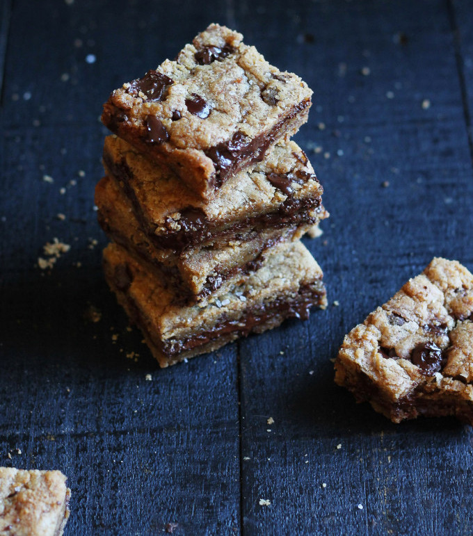 We’re finishing our month of chocolate desserts with an insanely delicious one from Monique of Ambitious Kitchen. Rich chocolate chip cookie dough, gooey Nutella and sea salt come together to create the ultimate dessert. Here’s how to whip up these blondie bars…