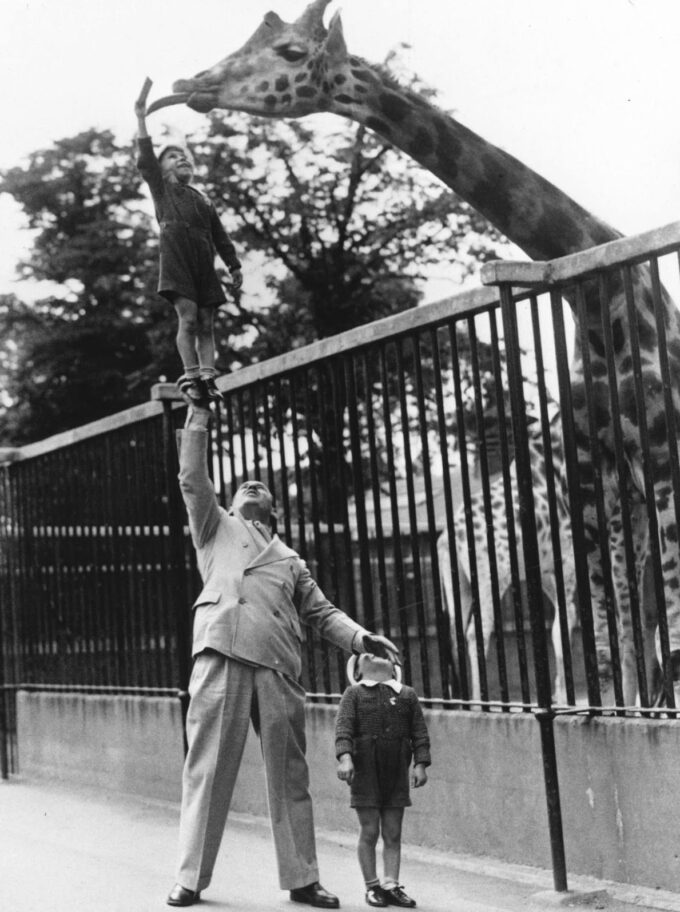(Photo of circus entertainer Paul Remos and his sons feeding a giraffe at the London Zoo, 1950s)