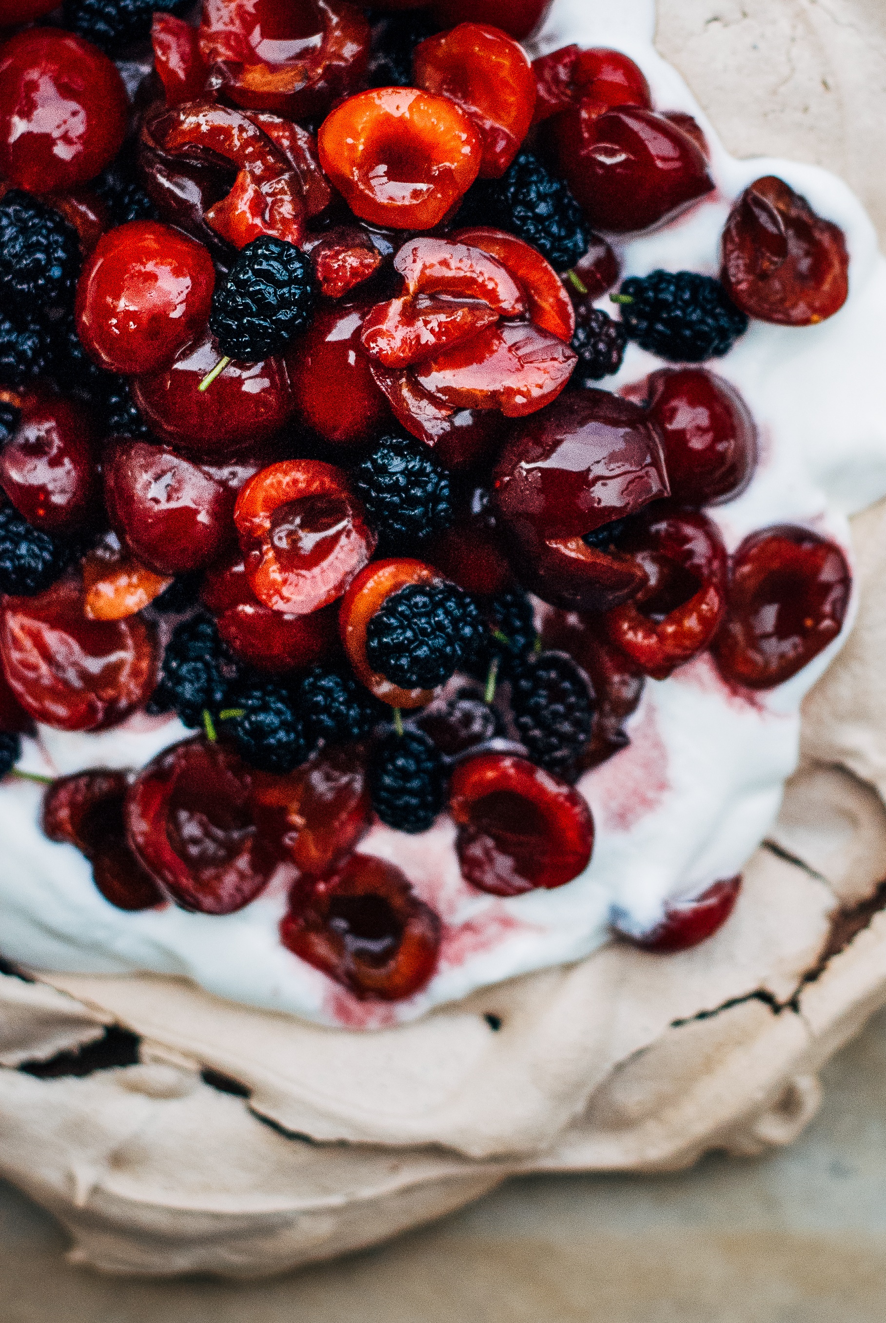 Once you’ve baked your pavlova, top it with a generous dollop of barely sweetened whipped cream (also excellent for masking imperfections) and a pile of ripe cherries, berries, or other seasonal fruits.