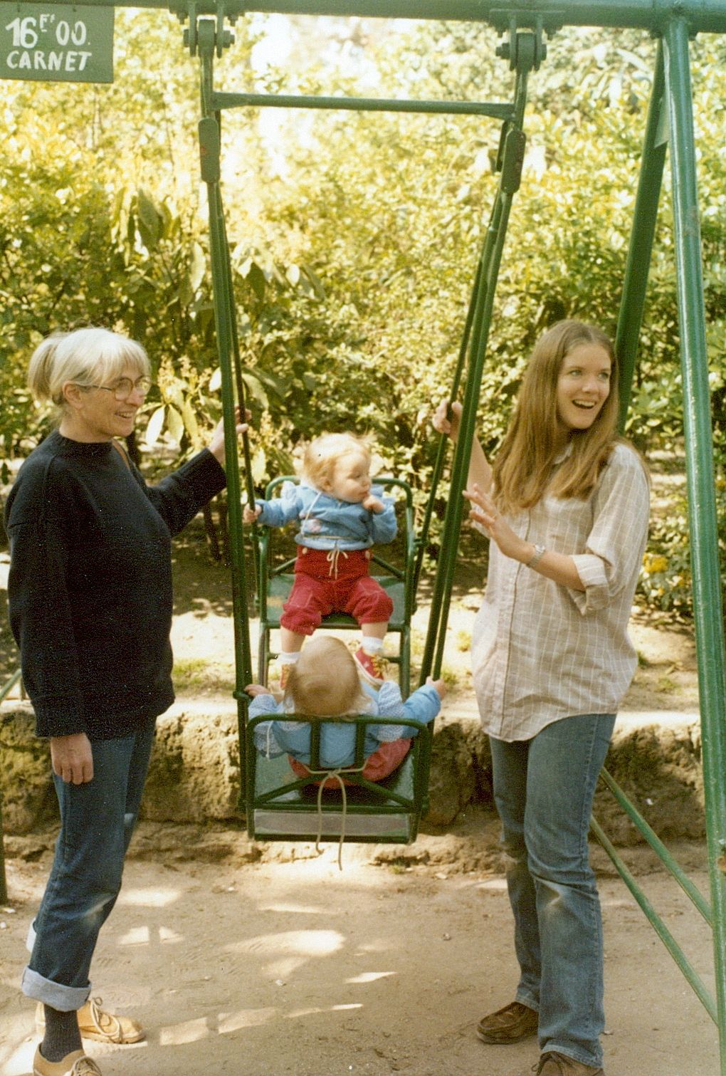 Hanging out with our mom and grandmother. (Look at the rope ties on the swings!)
