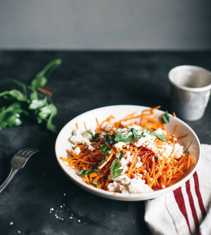It’s as simple as chopping carrots and then topping them with a tangy pickle dressing, feta and parsley. The vinegar/sugar/salt combo in the dressing is perfect for that quick pickle flavor, without months of preserving. Cayenne pepper packs a subtle punch, which you can adjust to your taste.