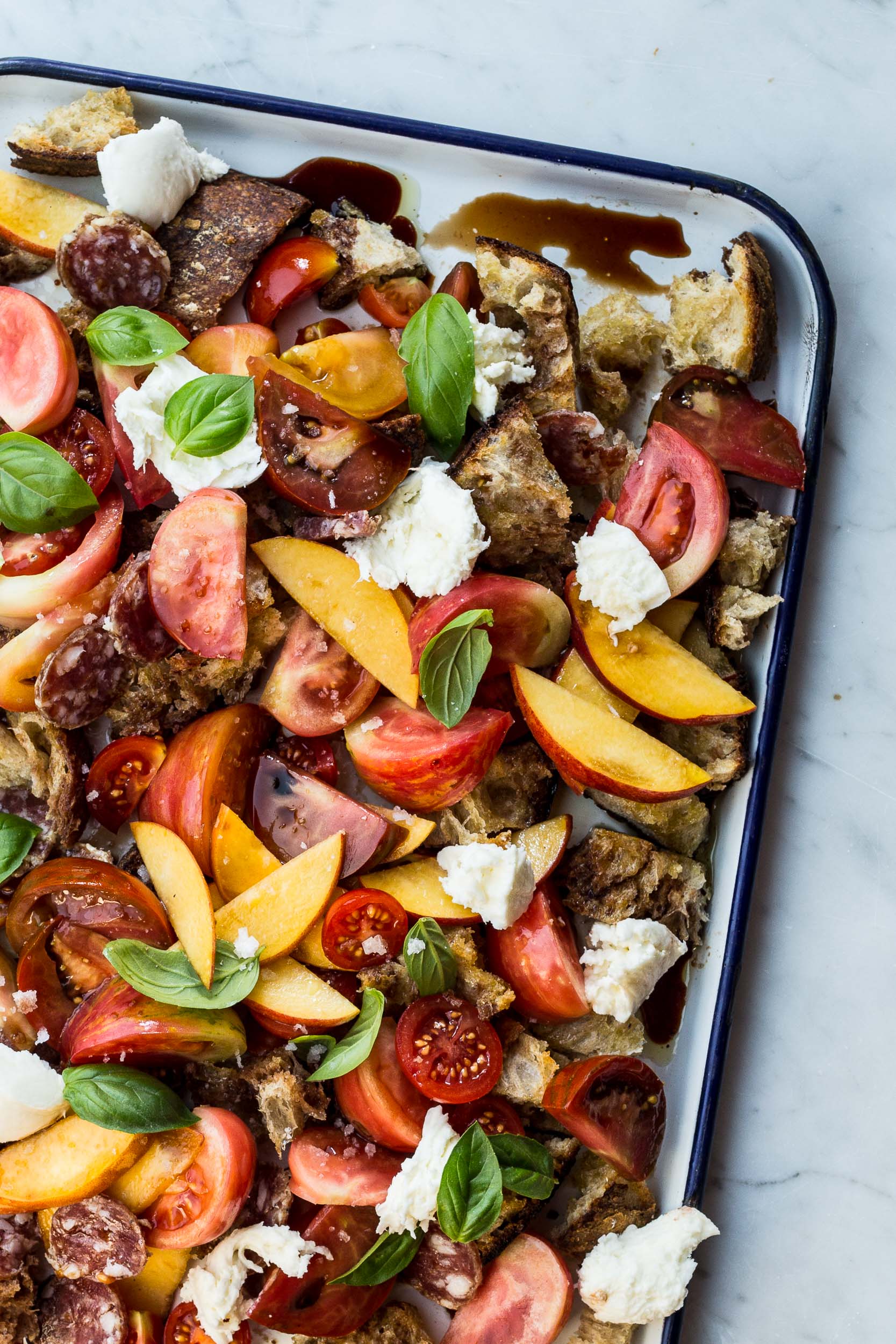 What’s the easiest way to make a salad more delicious? You guessed it: bread. So today, as we continue our month of tomatoes, we’re sharing a beautiful panzanella salad recipe from Ashley Marti of Local Haven. With juicy peaches, fresh mozzarella, heirloom tomatoes and dried salami, it strikes the perfect balance of sweet and salty. Here’s how to make it…
