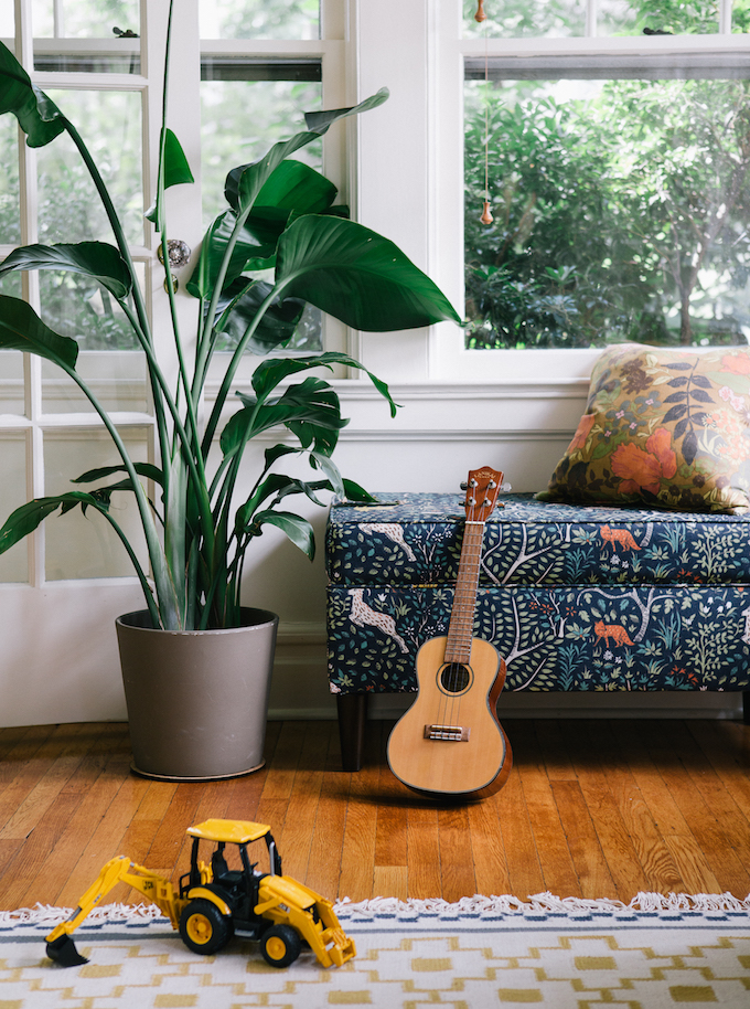 Armchair: Anthropologie. Standing planter: West Elm. Art on mantle: SwallaStudio. Toy piano: Land of Nod.