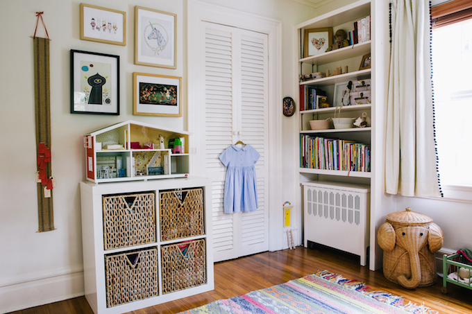On kids’ art: Finding pieces for the kids is license to choose things I’m drawn to that would be too playful for my own room. I try to stay away from anything really cutesy or gender-specific, and I’ve lucked out on great pieces in thrift stores — often a gold mine for vintage kids’ decor. I love the owl piece here, which is an old string artwork made with nails and thread.