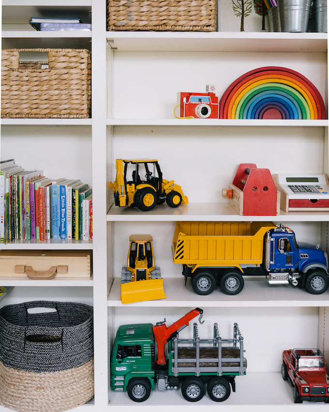 On swapping out toys: We have two big bins of toys that I rotate in and out of their room — funnily enough, the less stuff that’s here, the more they’ll actually play with. There has to be breathing room. Their favorite toys are open-ended ones like Magna-Tiles or great blocks. There’s so much awesome play that comes with the freedom to imagine what to do.
