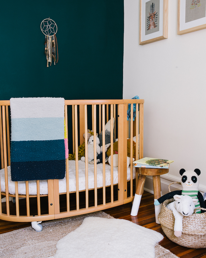 Crib: Stokke. Dipped stool: Serena & Lily. Paint color: Bavarian Forest.