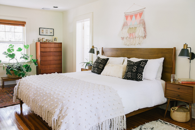 Wall lights: Rejuvenation. Tapestry: Maryanne Moodie. Bed: West Elm. Nightstands: West Elm. Bedspread: Mexichic. Duvet cover: Linoto. Sheets: Matteo.