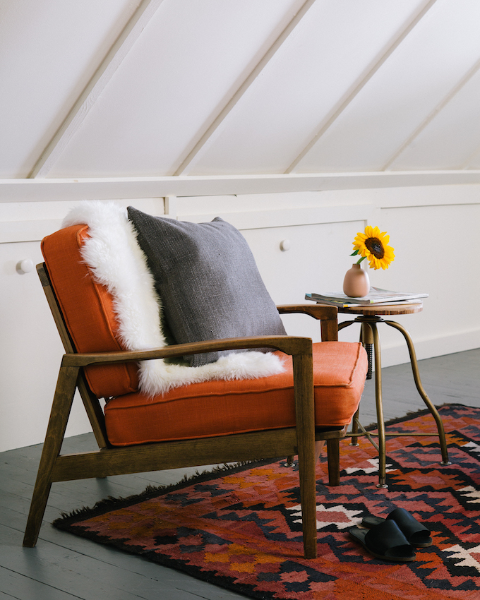 On hosting guests: We recently turned our attic storage area into a guest room. I love how peaceful it is now. When you lie in bed and look out the skylight, all you see are the trees. We have three sets of grandparents who stay in this room, and we had them in mind when trying to make the space comfortable. I always put flowers in there for them, and we stash lots of extra blankets and pillows.