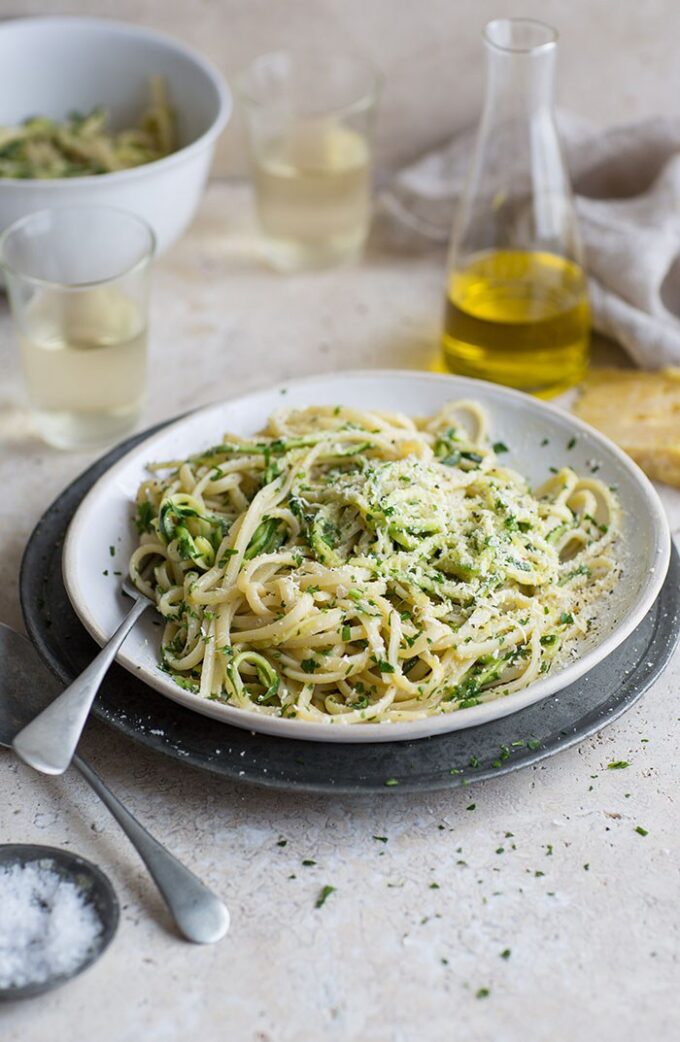 This dish combines raw zucchini with cooked pasta for an amazing texture — the zucchini also makes the dish lighter and healthier. There’s a minimal amount of preparation, and you can make the zucchini “noodles” while the pasta is cooking. It’s the perfect meal to whip up for a weeknight dinner.