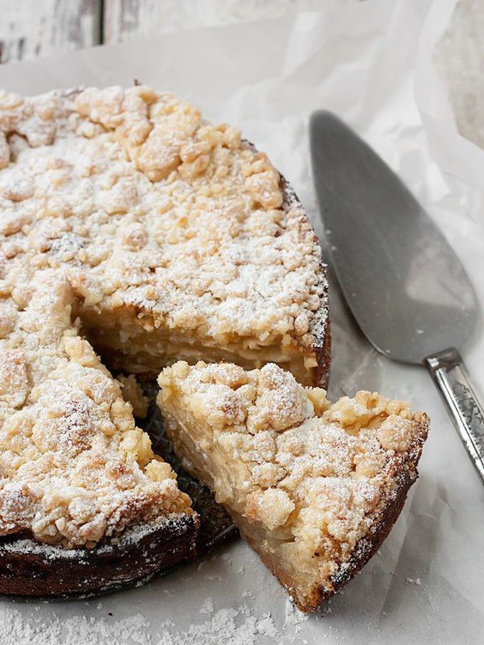This cake has a shortbread-like base topped with tender apples in a thick sauce. The crumble topping provides the perfect sweet crunch. It’s tasty either at room temperature or slightly warm. Serve with a scoop of vanilla ice cream.