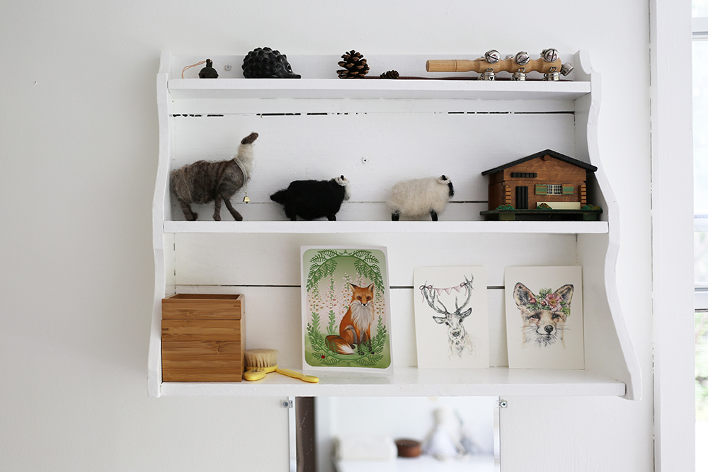 On baby treasures: Cleo’s most precious belongings are on her little shelves. We saved the first pinecone she ever picked, and the felted animals are from her grandmother. There’s a little antique music box from the Swiss Alps that she loves to listen to when she wakes up from a nap. She has a lot of little foxes, which people give to her as presents — her middle name is “Fox” after the fox families that we see near the house.