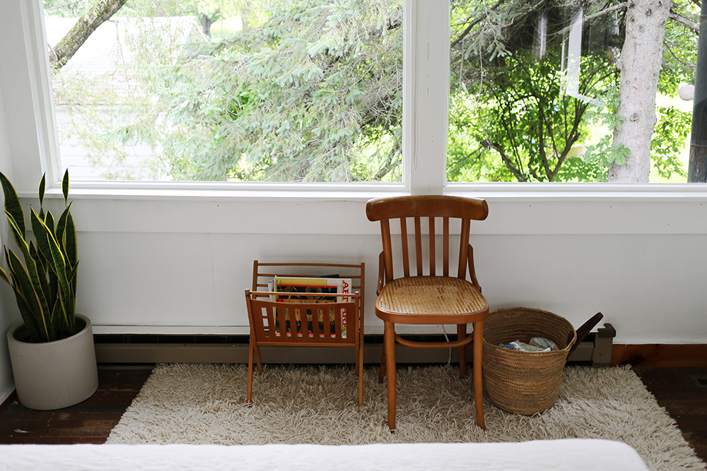 On mood lighting: Our bedroom lamp was too bright and I didn’t love the shade, so I put a small linen tablecloth over it. It made it more visually interesting and textured. I also like the honey tones of woven baskets and how tactile they are. They make the room warmer.