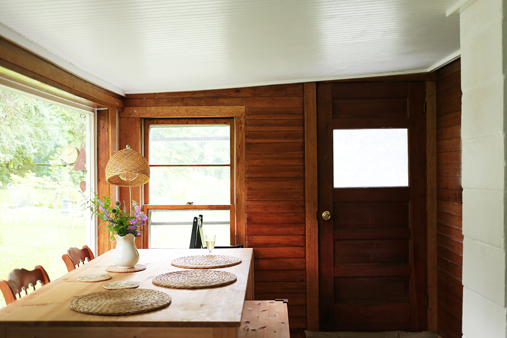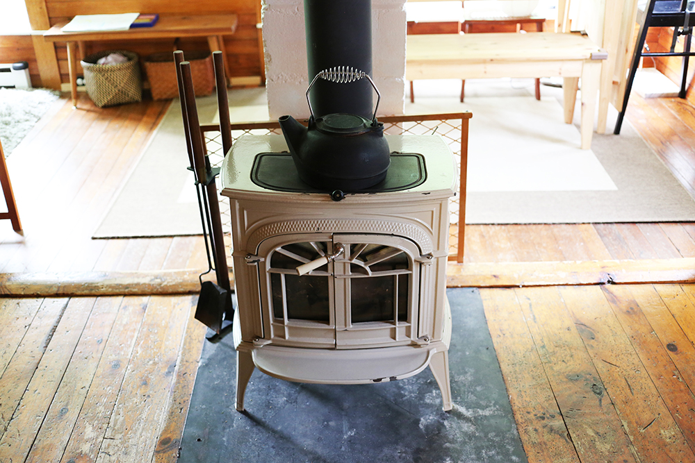 On keeping warm: Pretty much everything in the house has a practical use. Our enamel wood stove is from Vermont Castings. It gives off an ton of heat, and you can see the glow of the fire. We also keep a teapot on top in the winter and fill it with water. The stove heats it up, and the steam keeps the air from getting too dry.