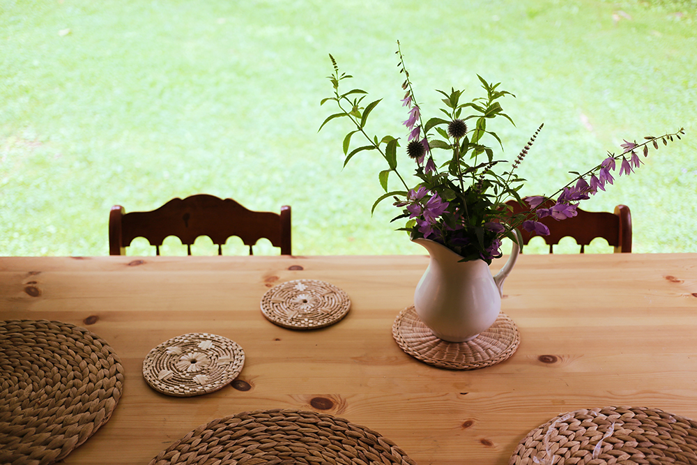 Placemats: Ikea. Woven trivets: vintage. Antique ironstone pitcher: Lonesome Woods. Woven lamp: vintage.