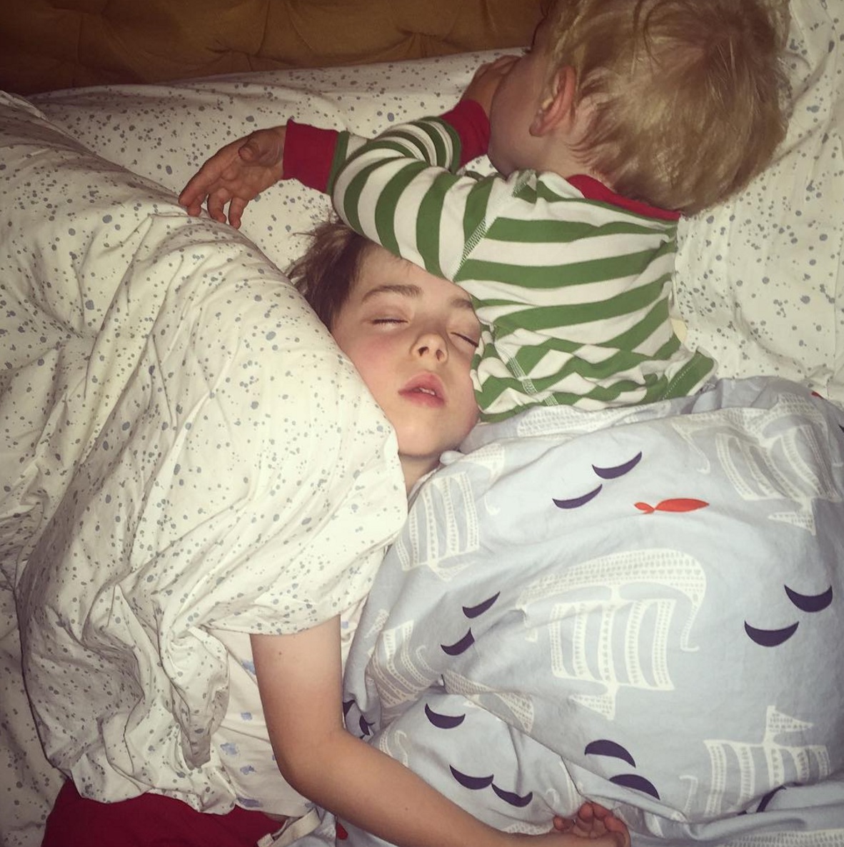 Now after moving apartments, the boys have continued to sleep together.