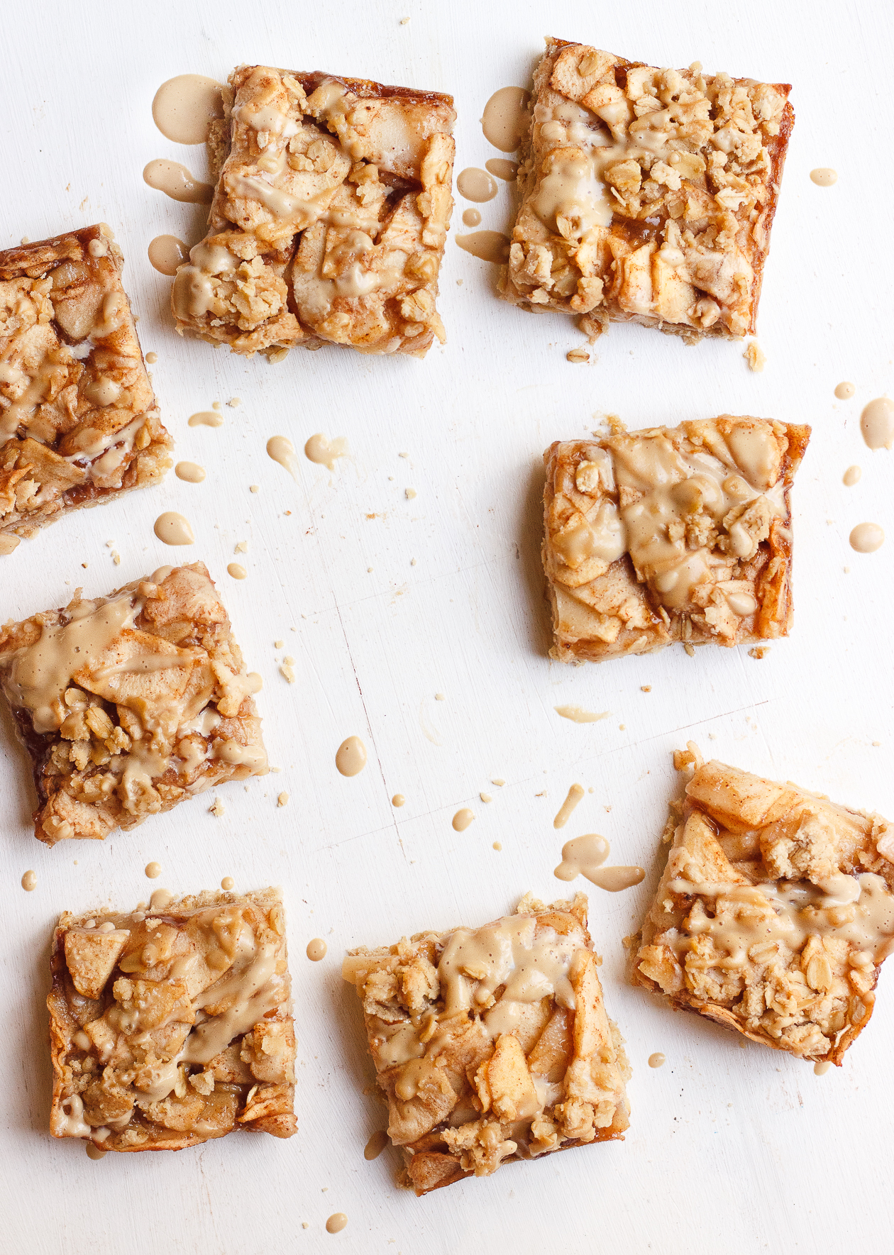 Set aside 1/3 cup of this mixture for the crumb topping. Press the remaining mixture into the lined dish. Pour the apples into the dish, pressing gently. Crumble the remaining oat mixture on top and bake for 40 minutes. Allow the bars to cool almost completely inside the dish. Remove the bars and cut into 9 squares.