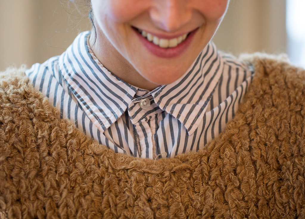 “When I was pregnant, I wore stuff from the J. Crew men’s sale rack. It’s the best place to find a classic, oversized look. This striped shirt is a men’s extra large and after having babies I cut the bottom and sleeves off. Now I use it for layering all the time. Most mornings I get ready in five minutes because I’m taking my kids to school, so there are little mantras I use when getting dressed. One of them is ‘go monochromatic.’ If I put on a camel sweater and pants, to me it looks a little more elevated and planned because it’s monochromatic.”