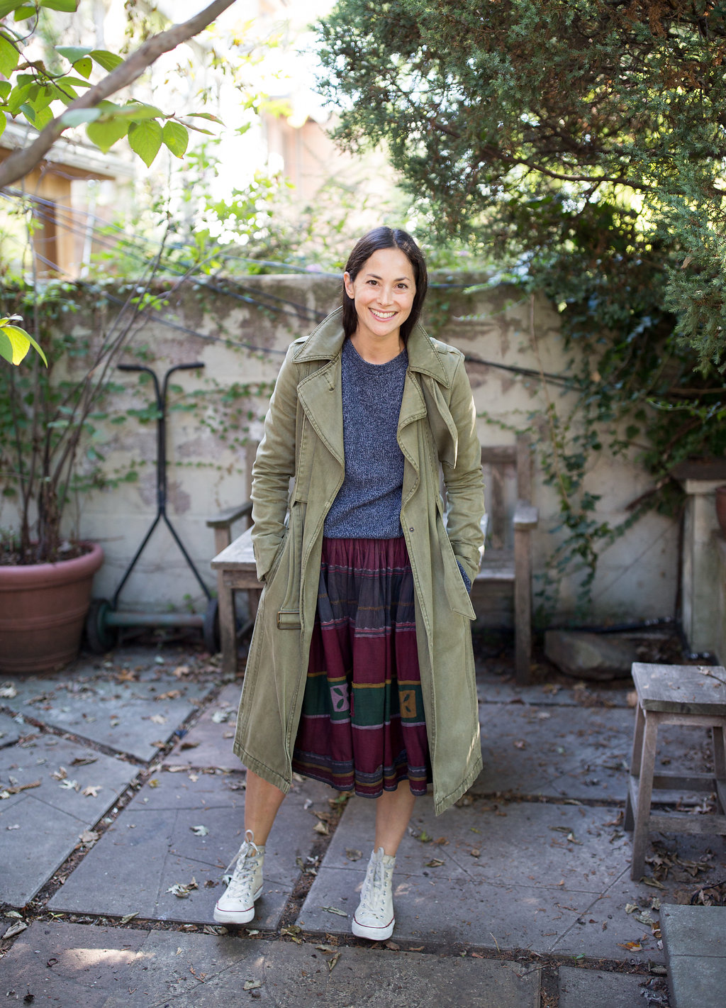 Sweater: Uniqlo men’s. Skirt: from India, similar. Trench: Unis, similar. High-tops: Converse.