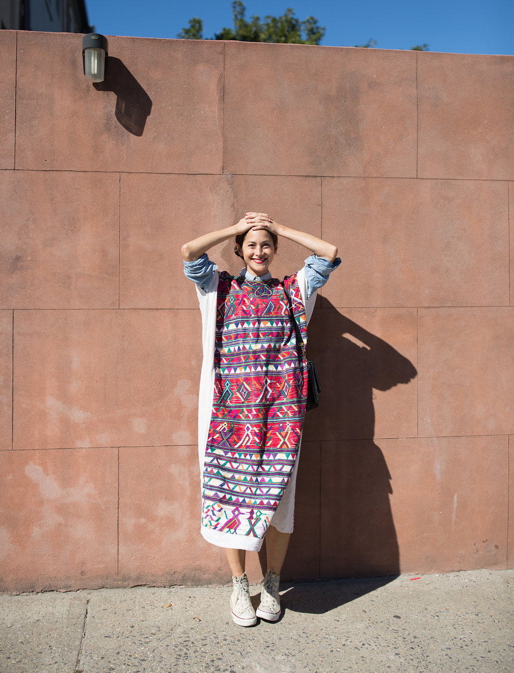 “This dress is crazy so I try to temper it with a chambray shirt underneath. Narnia, where I got it, is the best vintage store in the world. This dress was $25. I realized if I played it down by adding a chambray shirt and high-tops, it would reflect real life. That helps it feel more down-to-earth, versus kooky. I wear it with Adidas shower slides in the summer. I try to keep the whole thing really chill. It has its own energy.”