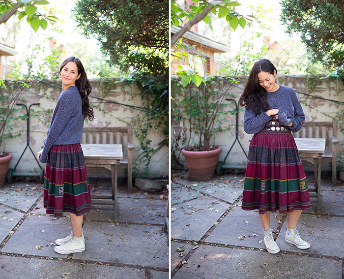 “My husband and I went to India for our honeymoon, and I found this skirt in a vintage store. I loved the mirrors around the waist. I didn’t wear it for 10 years, but now I’m like, what took me so long? The message is definitely ‘don’t discredit the crazy things in your closet.’ The mirrors aren’t an everyday look, but with a big sweater over it, it works! Layering solves everything. My favorite layering pieces are black turtlenecks, chambray shirts, denim jackets, white fishermen’s sweaters and trench coats.”