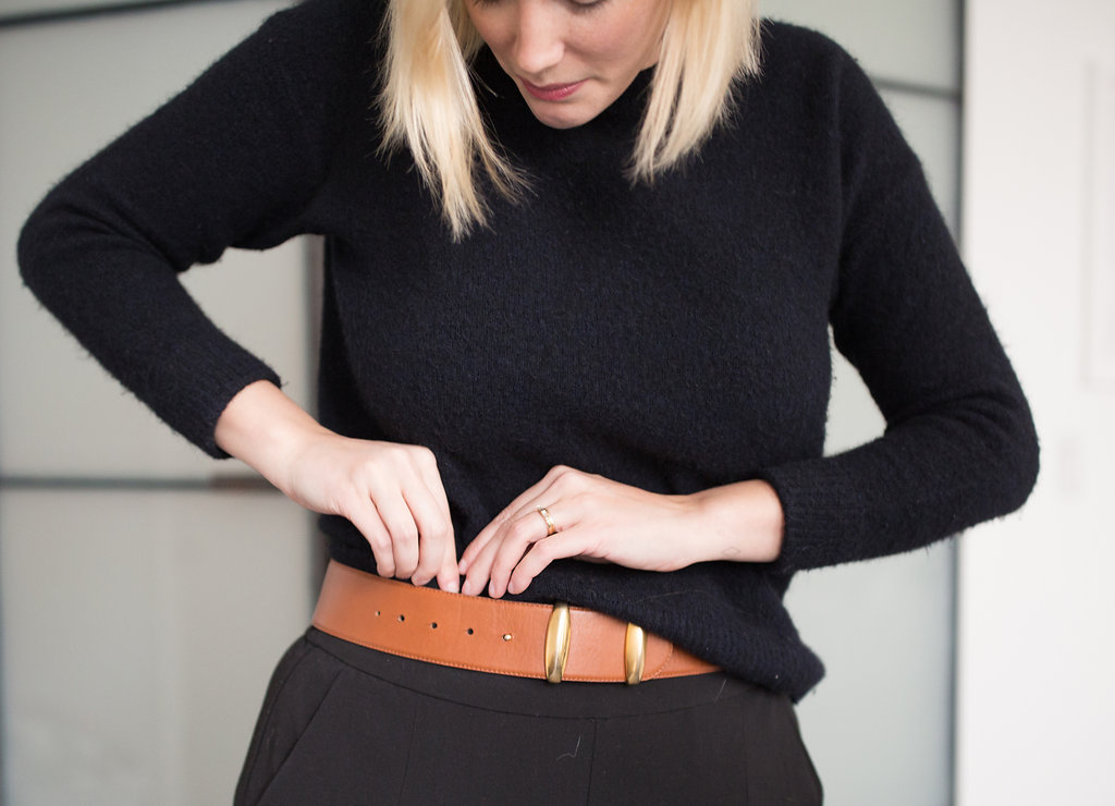 Sweater: from Japan, similar. Trousers: Madewell. Belt: Vintage Donna Karan, similar. Shoes: Jenni Kayne. Lipstick: RMS Beauty.