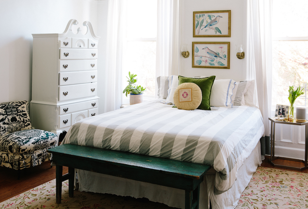 Chair: antique reupholstered in Pierre Frey fabric. Side tables: antique, similar. Bedding: Pottery Barn.