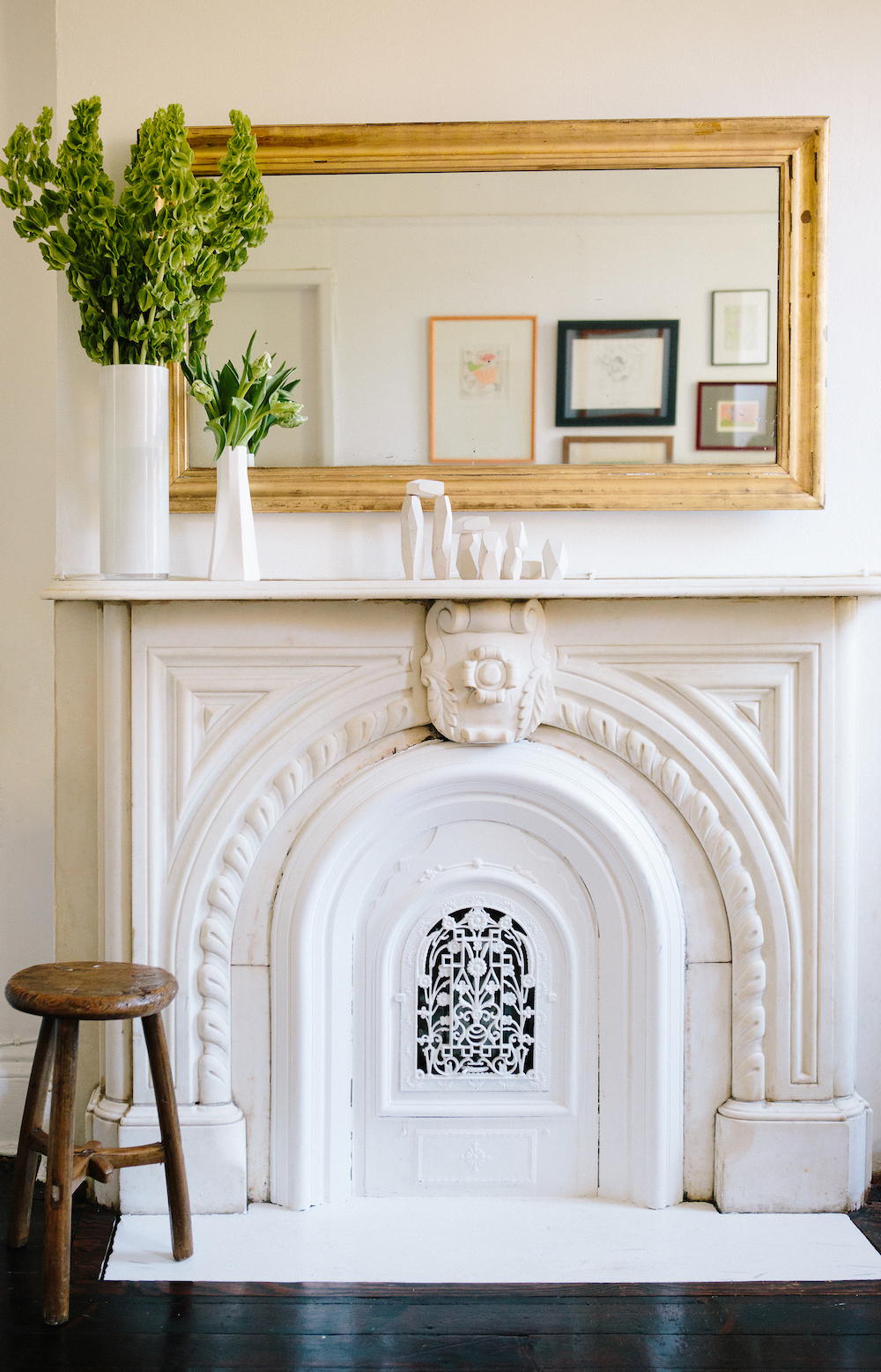 On a conversation piece: The wood blocks on the fireplace are such a conversation starter. People will ask about them and start rearranging them. They have slanted surfaces, so you have to figure out how to stack them so they won’t fall. In the larger vase, I sometimes put dried flowers or sticks of cherry blossoms. It adds scale and brings your eyes up.