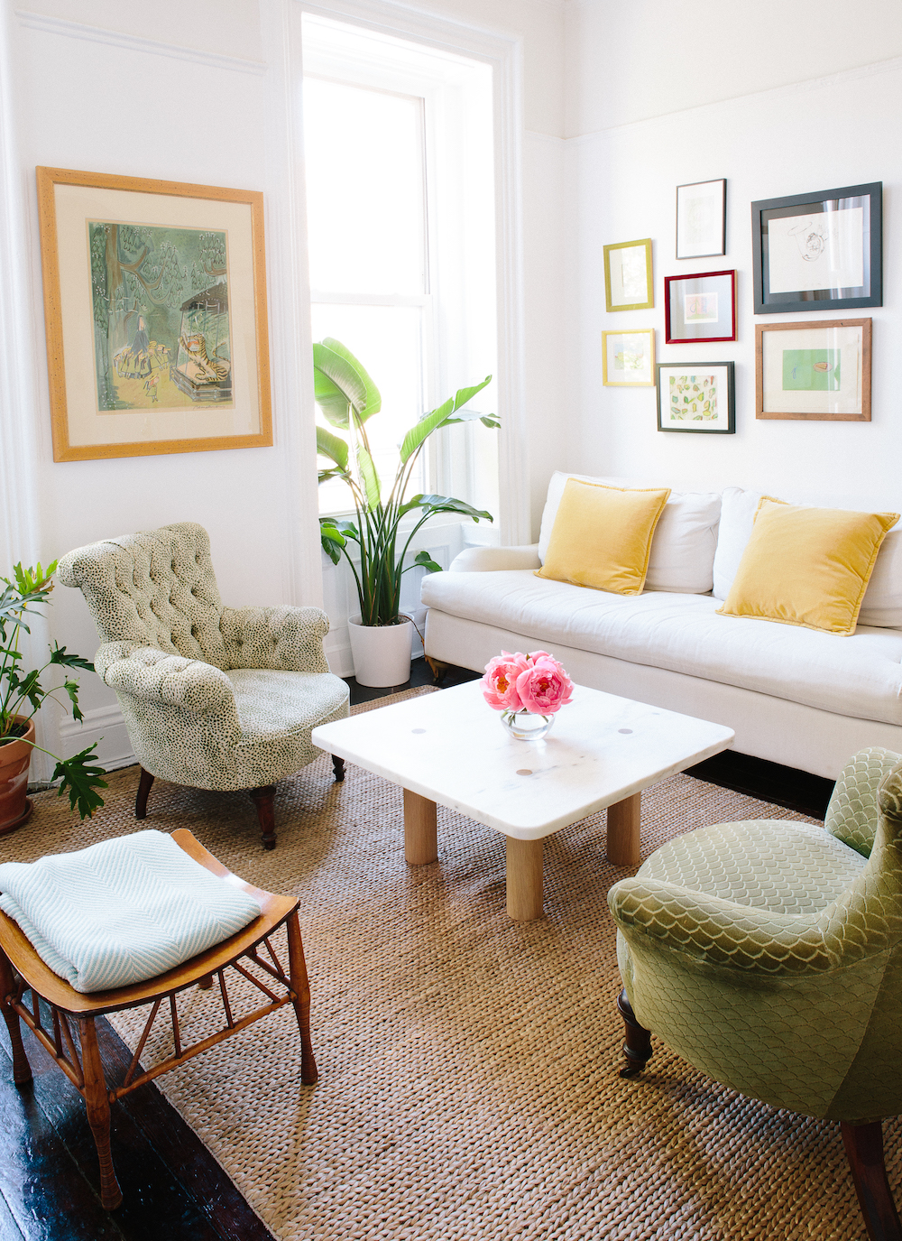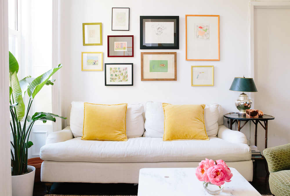 On early art collecting: My parents’ close friend Lewis is an artist. Growing up, every Christmas, he would give us a little sketch that my mom would then frame for us. It was such a sweet tradition. Now, almost everything above our couch is his work. Crazily enough, my great-grandmother was friends with Ludwig Bemelmans, who created Madeline, so the black framed piece is by him.