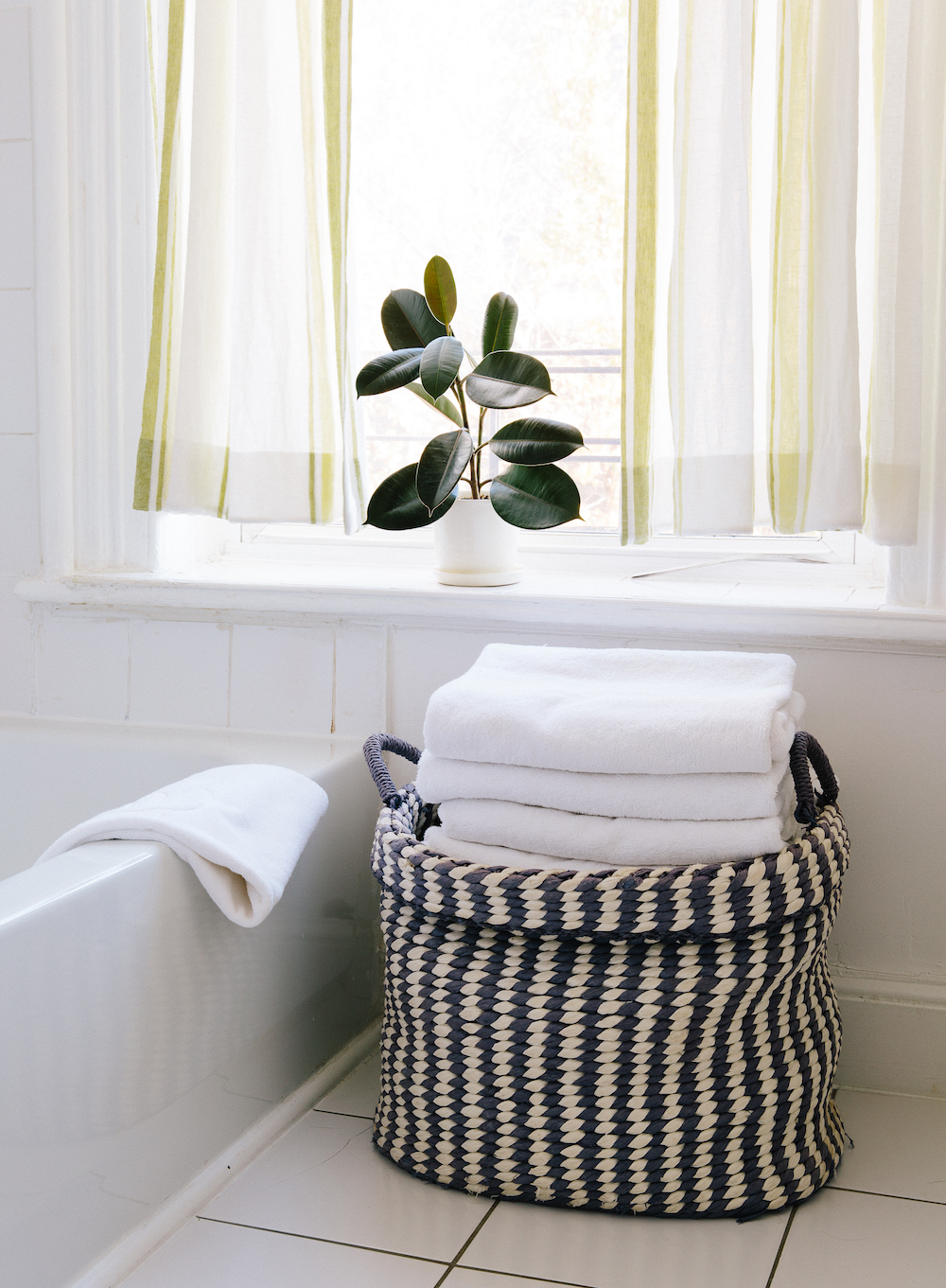 Basket: antique, similar. Curtains: Ralph Lauren fabric. Pot: Kaufmann Mercantile.