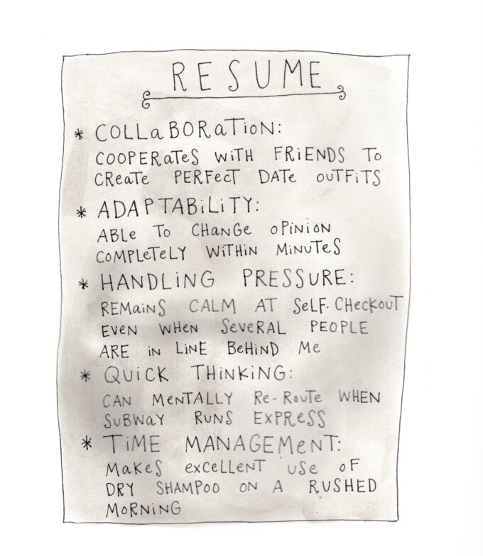 This comic is a little disappointing! You can be both funny and adult in your humor- this makes an applicant seem like a child who cares about nothing other than giggling with girlfriends and painting nails! How about instead of changing your opinion you put in ” Able to use intelligence and charm to change people’s opinions in minutes”. I mean, we aren’t children here! Give us STRONG women some credit!
