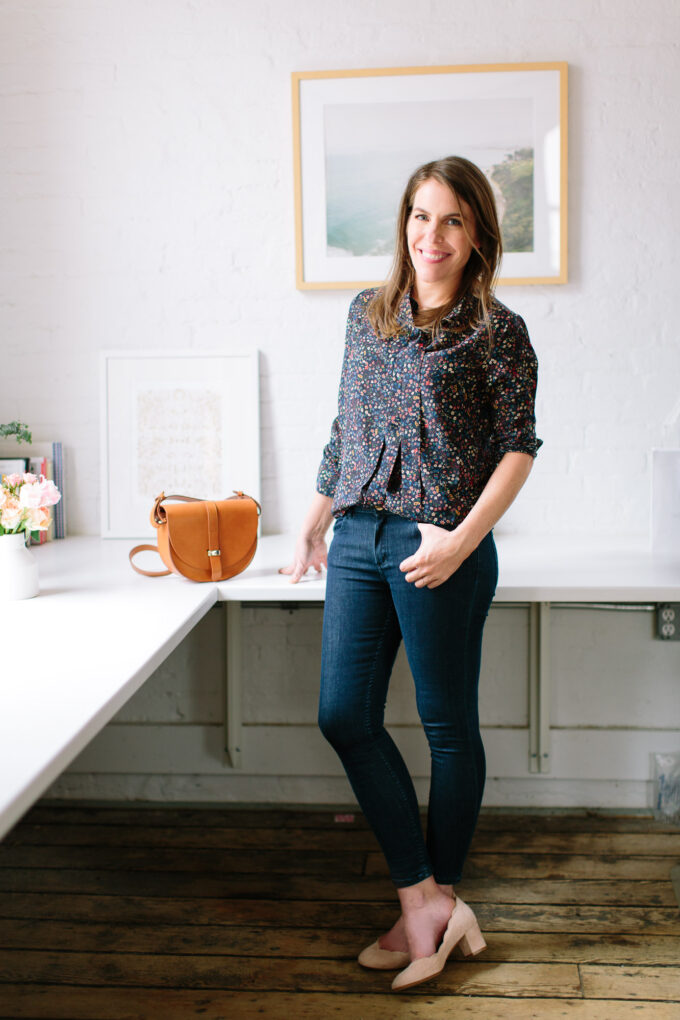 At the office, I wear Perfect Slim 7/8 jean with a floral blouse and scalloped block heels.