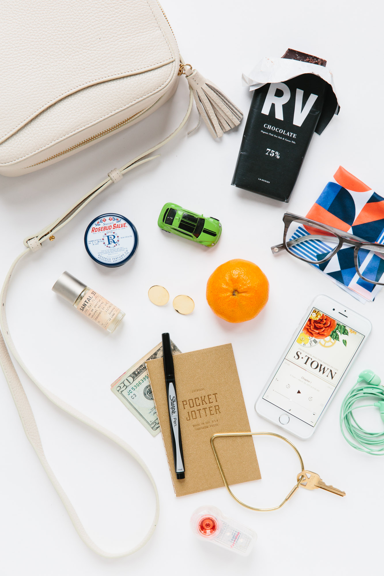My essentials: a musky perfume, lip balm, a small toy to keep the boys occupied while waiting at the bank or grocery store, a notebook for random ideas, a bike light, and a compelling podcast loaded on my phone. Everything else goes in and out depending on the day’s itinerary (lately, chocolate has been making a cameo).