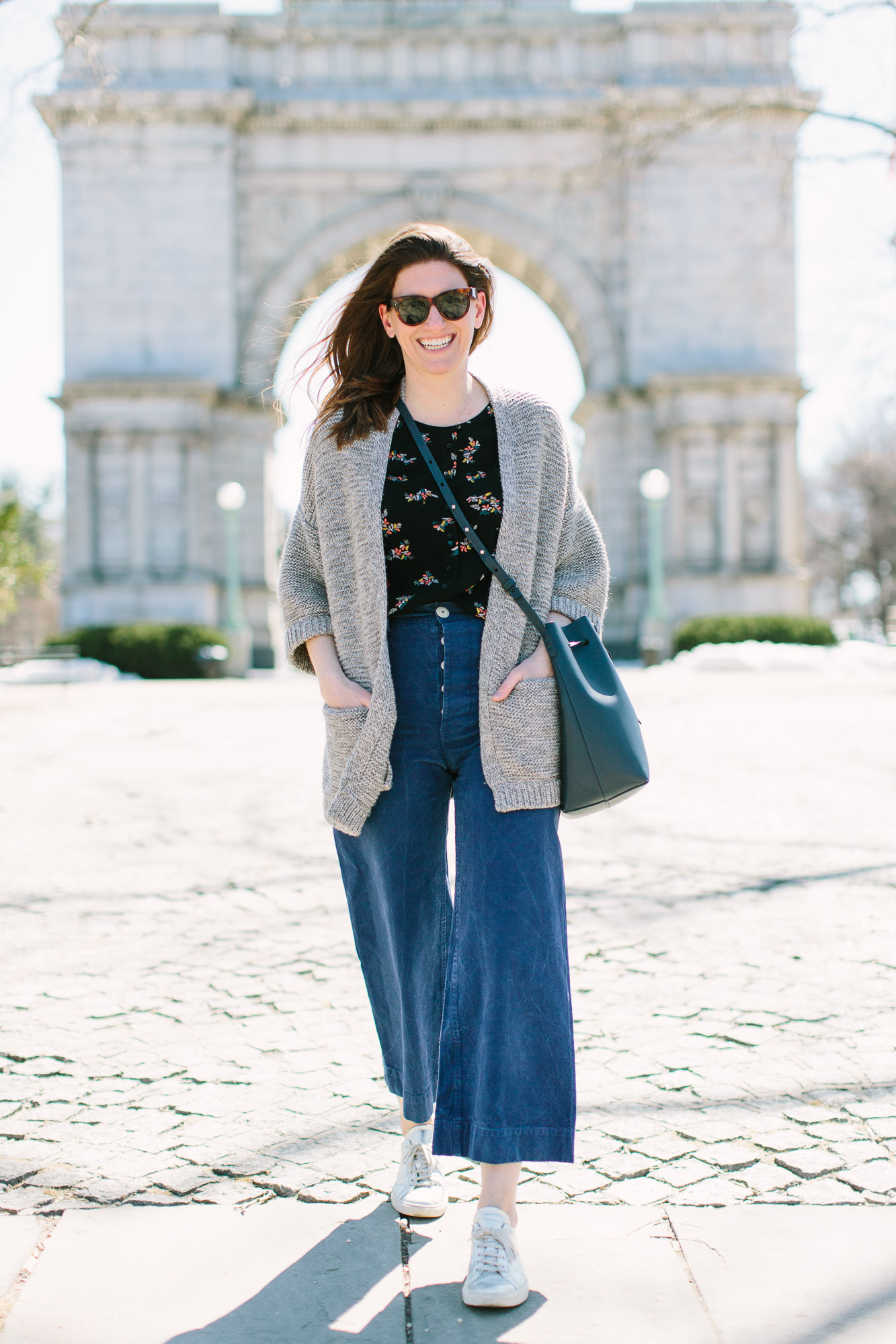 Shirt: Sessùn. Cardigan: similar. Pants: Jesse Kamm. Sneakers: similar. Bag: Mansur Gavriel.