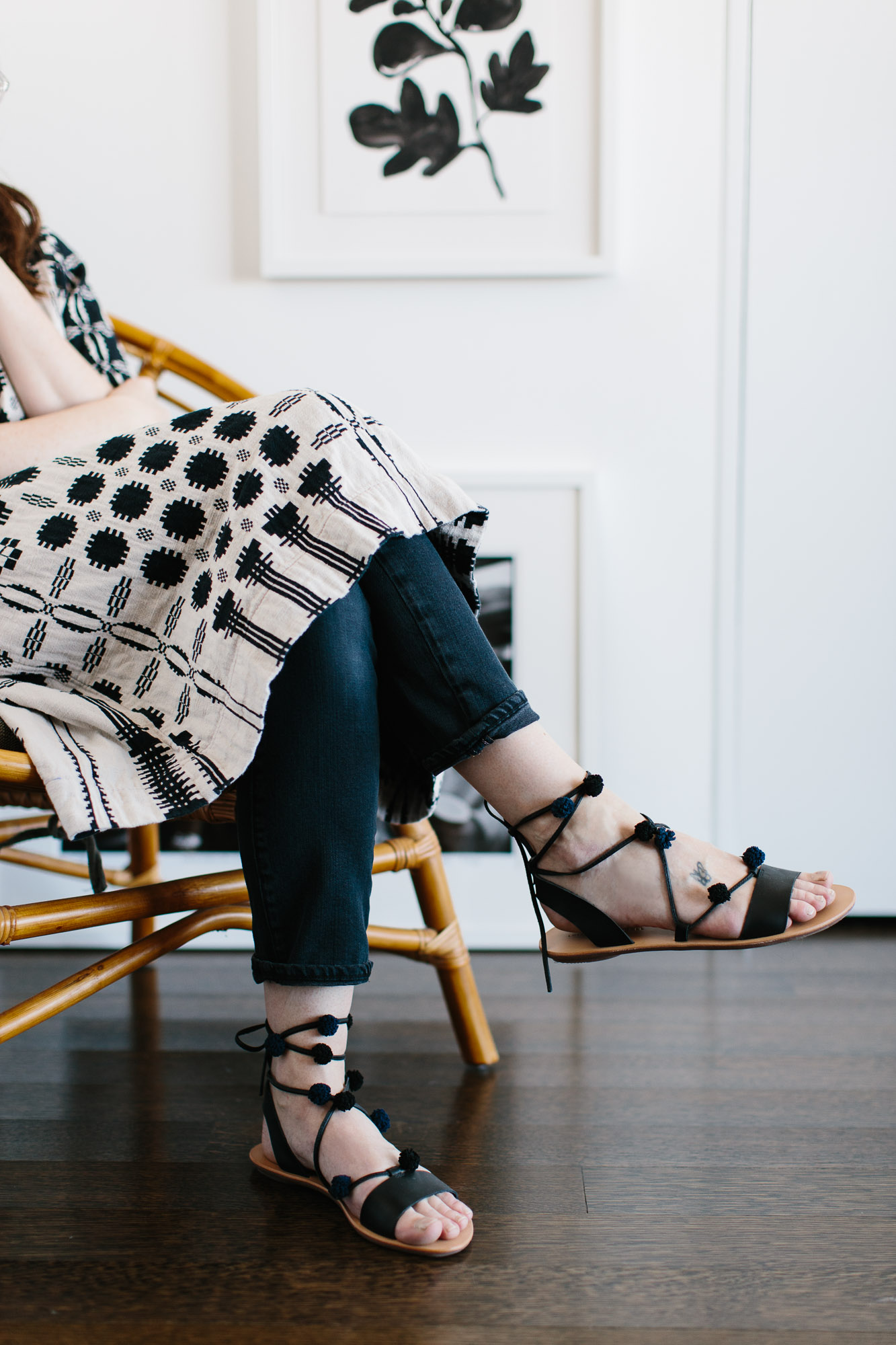 “When shopping, I look for clothes that are workhorses. They have to hang in there. (I still wear the first pair of jeans I bought when I moved to New York 15 years ago; there are now holes in the knees.) For that reason, I’m a huge fan of Loeffler Randall — I wore their shoes at my wedding over ten years ago! These pom pom sandals are so comfortable; the bottoms are almost gummy. I’ll wear them to death. P.S. My foot tattoo is a butterfly. I was 15. My mom did not freak, but my dad FREAKED.”