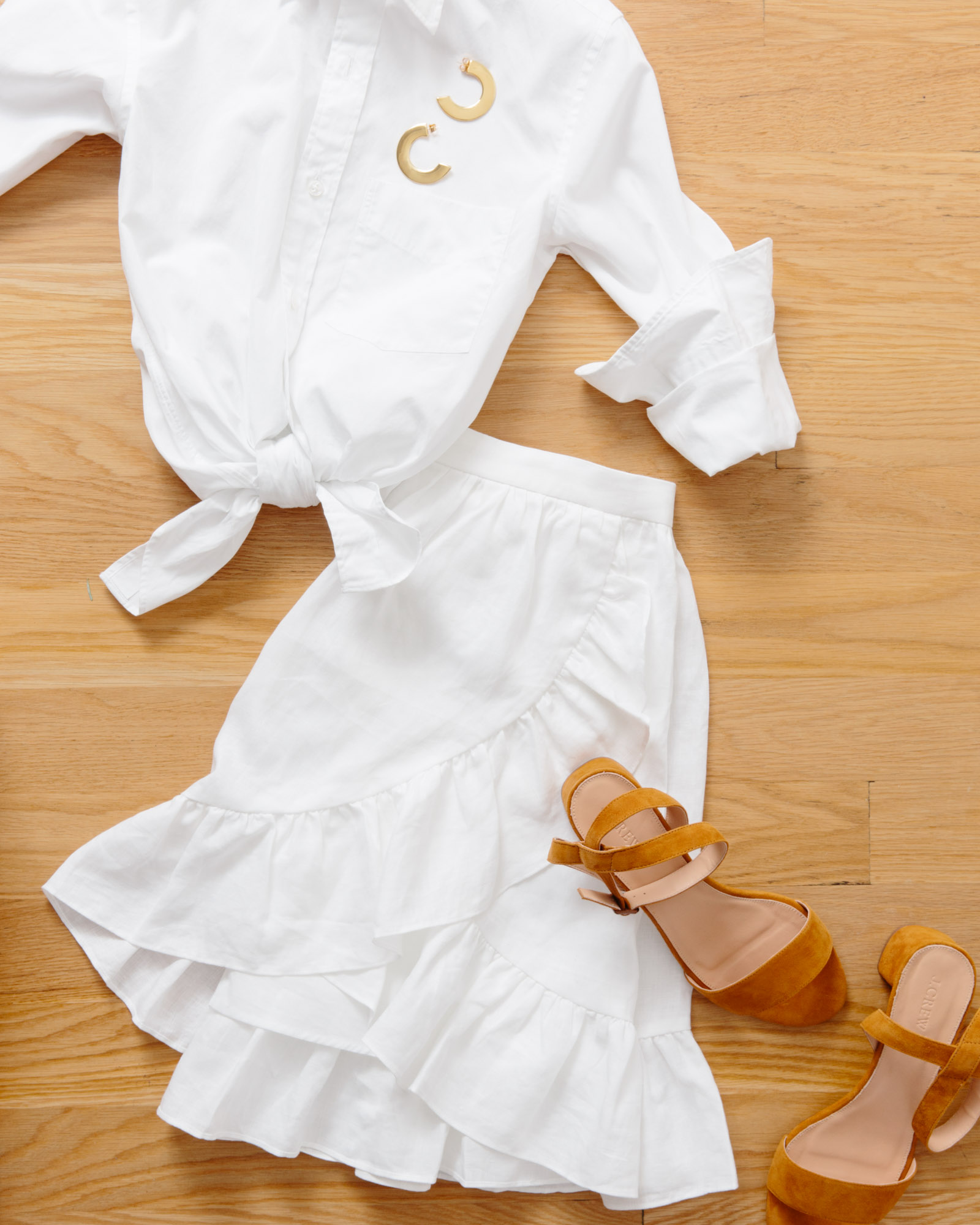 Buttoned shirt. Disc hoop earrings. Flirty skirt. Comfy heels.