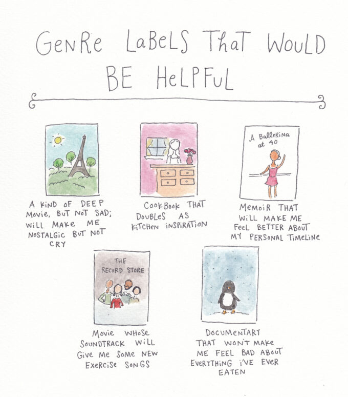 Always love these little illustrations – so sweet! The documentary one is spot on – there are specific movies I avoid watching because I KNOW I won’t be able to eat anything if I watch them. ;)