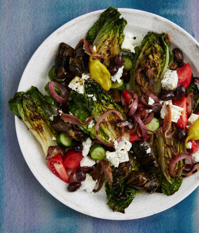 This salad proves that rules are meant to be broken. I have always considered the classic Greek salad to be the platonic ideal. I balk at fancy upgrades since the cheap red wine vinegar, kalamata olives and romaine are fundamental to the dish. Hell, I even prefer stuffed grape leaves from a can to those from the deli counter. Then one day I had a few grape leaves left over in the fridge, and I tossed them on the grill to warm them up. The oil-marinated leaves crisped, the rice steamed and softened inside and I had somehow managed to improve upon my favorite snack. With the rules out the window, I tossed all the veggies on the grill (save the cucumbers and tomatoes), and it worked. It’s not a replacement for the fresh Greek salad, but with the old-school Greek diners becoming a thing of the past, this is a fun variation to make at home.