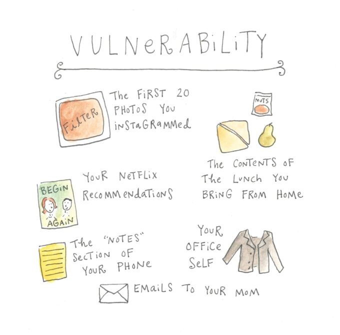 Hmm… I think this one just scratches a tiny bit of the surface. Vulnerability is so much more. And terribly important. Try reading or listening to Brenè Brown’s book/ audiobook “The Power or Vulnerability. In it she discusses how being truly vulnerable can change your life and why it’s so critical, especially for women, to open up and be vulnerable. I now look for this capacity in all my friendships. I used to be “friends” with other moms who could only go as far as, “my baby spit up on me in public” (wow welcome to motherhood). and projected perfection like it was their life’s calling. I found a friend who has become my best friend simply because she was willing to open up to me about her struggling marriage. We are so close now, I don’t know what I’d do without her. Give me someone real any day. It’s so hard to connect and be real with people who cannot be vulnerable- usually a waste of your time! Perhaps being in my 30s has helped me to factor this in my relationships- highly recommend the book!