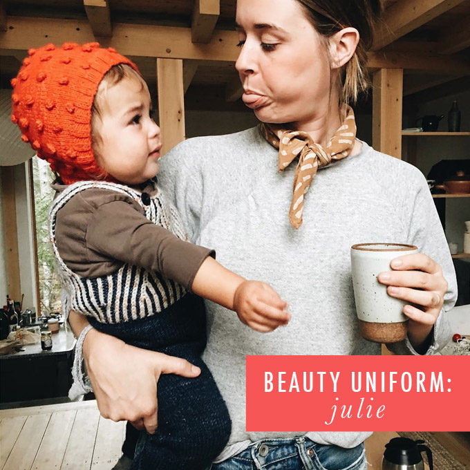 Julie O’Rourke lives on a tiny island in Maine with her partner, Anthony; toddler, Diogo; and dog, Violet. The owner of Rudy Jude, a children’s clothing line, she has a playful sense of humor that complements her laid-back beauty. Ahead, she talks about DIY haircuts, the best thing to bring on trips, and the beauty product you can find in the kitchen cupboard…