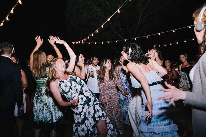 When Niko Herman and Emily Distel Herman were planning their wedding reception on Martha’s Vineyard, they realized there was a strict noise ordinance — all party music has to stop on the island by 10 p.m. So, they came up with a way to keep the dance floor going: 150 wireless headsets tuned to the same playlist for a silent disco! “Taking your headphones off was a total trip,” Emily told us. “People looked insane in the best way, seemingly dancing without music. The only sounds were shouts of words or phrases from favorite songs, as well as shoes stomping on the floor. With headphones on, you felt like you were in a bumping club that happened to be in a field under the stars, next to the ocean.”