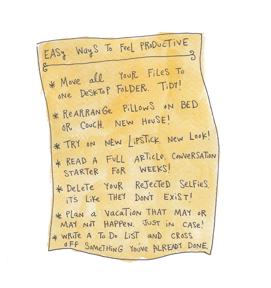 * Put the papers and so on cluttering your desk into a little Anthropologie shopping bag. Instant neatness and “organization”!