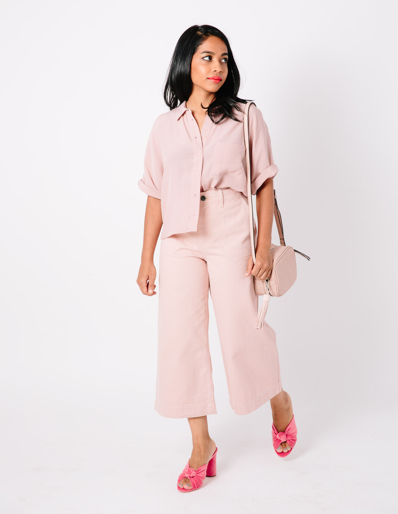 Lisa paired a slouchy blouse, wide-leg trousers and a crossbody bag in a similar blush shade, but tied the look together with a bolder heel. If you’d like to play with proportions, roll the sleeves of the blouse up, or do a half-tuck with the shirt. So cute, right? We’d also love to try this look with other colors, like a white button-up and white ankle jeans; or even just chambray and denim.
