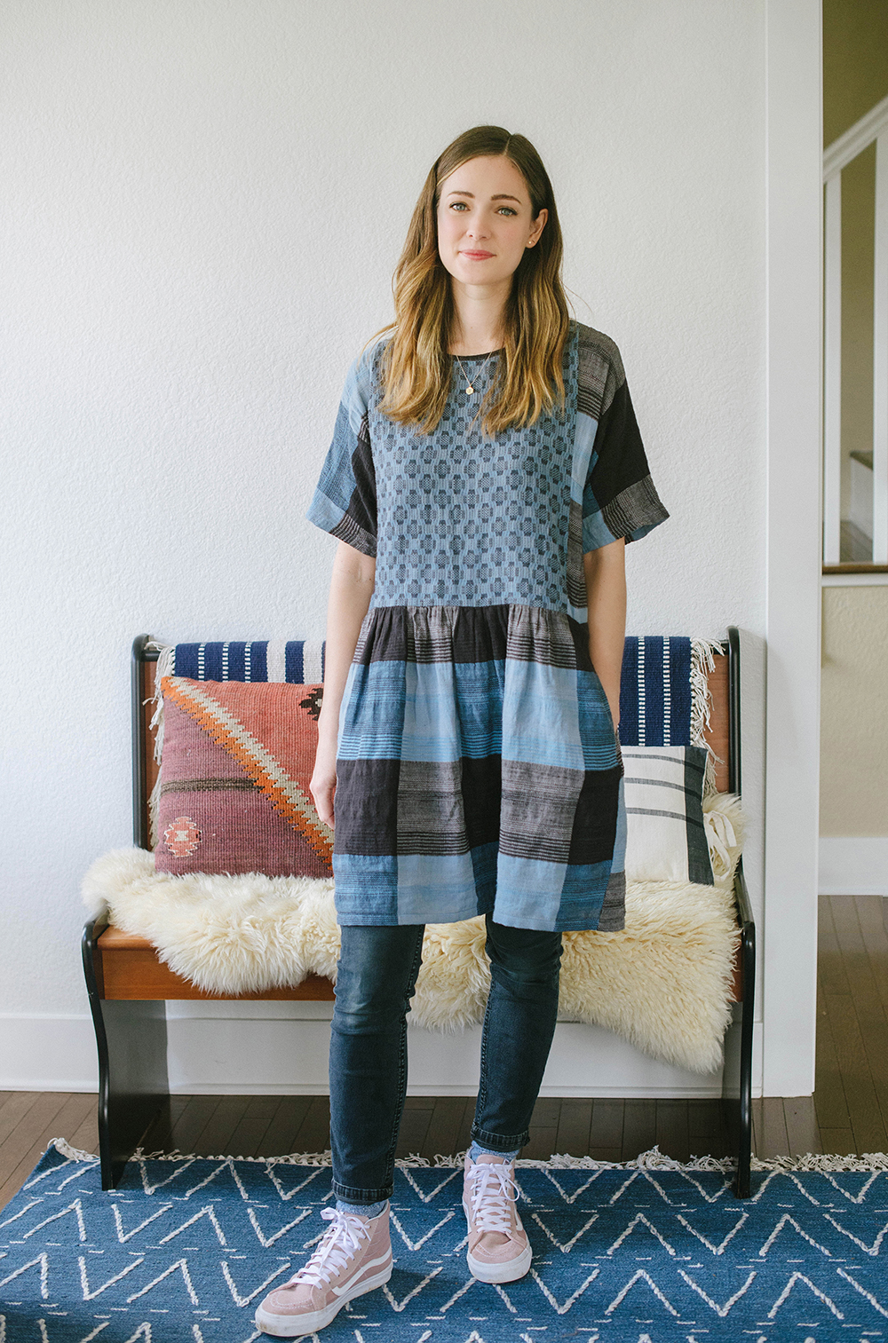 “This print on this dress is everything to me. As a maker of handmade things, I gravitate toward handwoven textiles with special stitching. One of the Ace & Jig designers lives in Portland; I’ll run into her once in a while, and she’s just a really nice person. Being a designer myself, I like supporting independent designers — like Another Feather, No. 6 and Baggu. I realize it’s a luxury to be able to shop this way, but I try to. Funnily enough, these socks are from Fred Meyer, the best grocery store in Portland. Every time I go, I get a pair. They’re 100% cotton and really soft. The first time I found them, I was like, these are goooood.”